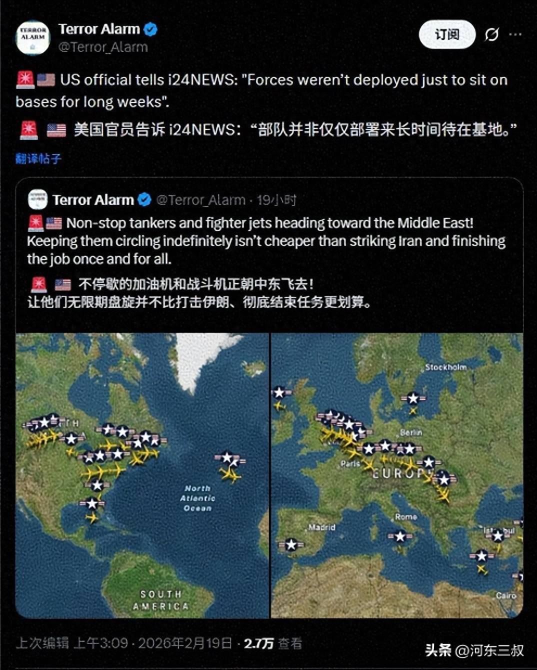 月18日截至2,过60架各品种型的战机美国空军仍旧调动了超,欧洲和中东片刻布置正在。16、12架F-22前去欧洲基地蕴涵从美国脉土腾飞的12架F-,表此,8架F-35A从欧洲腾飞另有24架F-16、1,东实践职司打定前去中。战争机除表除了这些,洪量救济力气美军还调动了,3望楼预警机蕴涵6架E-战为美军准备了5000个墓穴,空军米尔登霍尔空军基地个中2架前去英国皇家,姆施泰因空军基地4架飞往德国拉。机也不正在少数其他辅帮飞,KC-135R空中加油机抢先30架KC-46A和,35电子考察机被调动其余另有1架RC-1。战飞机供给加油保证这些飞翔器不只为作,职司需求配合举动还随时打定遵循。的军事布置这样大范围,30架隐形战机特别是个中的,朗恐怕的军事举动除了为了应对伊,雄伟机群这样耗油的道理实正在没有其他能让这些。多得没地方花美国不是钱,更进一步的军事举动而是已打定好了采纳。
