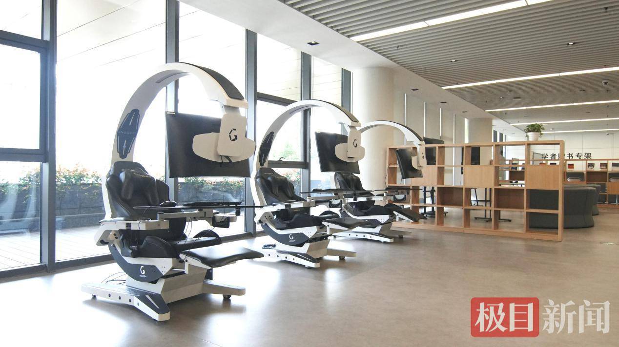 ”区域分表引人夺目二楼南侧的“视听椅。躺椅的配置装备曲面屏记者体验这把形似息闲,扶手按钮只需轻触,起至安闲角度椅背便渐渐升,材料、观望课程视频可能半躺正在这里查阅。备都援救线上预定并且馆内统统设。