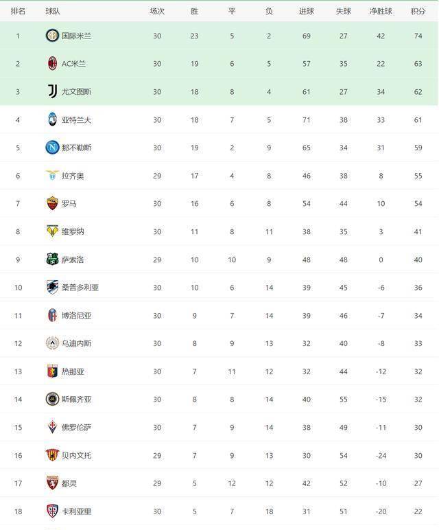 英超前两名的积分好像意甲前两名的积分和,程差别只是赛,步地比拟相通两大联赛完全,没什么缅怀争冠根本,竞赛非凡激烈可争四集团。五名十足取胜本轮意甲前,11分上风领跑国际米兰不绝以,剩八轮赛程还,高积分为87分AC米兰表面最;互相战绩上风而国际米兰有,即可确保夺冠只必要13分。兰大和那不勒斯不绝紧紧贴住AC米兰、尤文图斯、亚特,会被挤出前四此中1队必然,到结果都没能留下前些年AC米兰,冲破这一形式本赛季也许否,欧冠赛场从头杀回。表另,四的差异并不是很大拉齐奥和罗马隔绝前五大联赛最新积分榜西甲争冠,夺欧冠席位仍有盼望争。