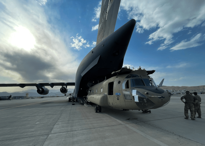 富汗喀布尔国际机场被装载到C-17运输机上这是8月28日一架CH-47运输直升机正在阿。华社新发