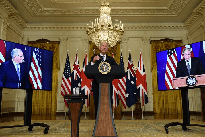15日9月,屏幕中)和澳大利亚总理莫里森(左侧屏幕中)实行视频聚会美国总统拜登(中)正在华盛顿白宫与英国辅弼约翰逊(右侧。社/法新华新