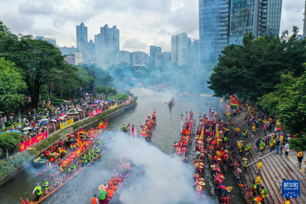 10日6月,到场“龙船景”(无人机照片)四里八乡的龙舟会聚正在猎德涌。