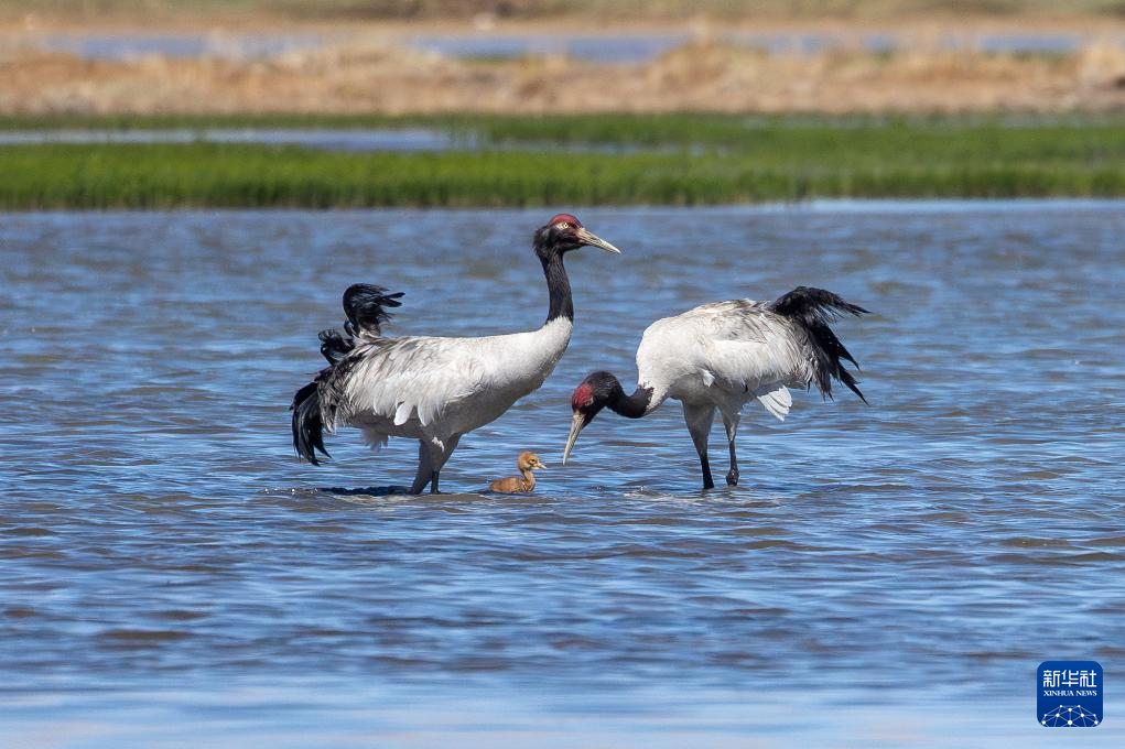 拔约4700米的湿地里正在西藏那曲市申扎县海,妇正正在滋长下一代一对对黑颈鹤夫。的幼黑颈鹤破壳不久,色的绒毛长着金黄,正在父母身边它们紧紧跟,觅食学着。