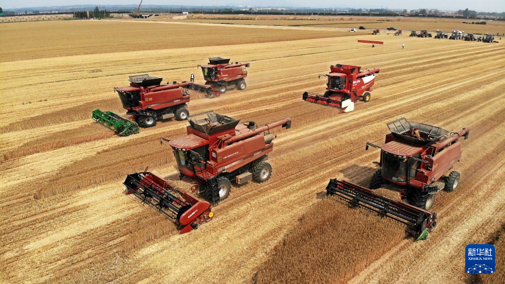 11日6月,庄村麦田里举行机收功课(无人机照片)收割机正在青岛西海岸新区大场镇陈家幼。