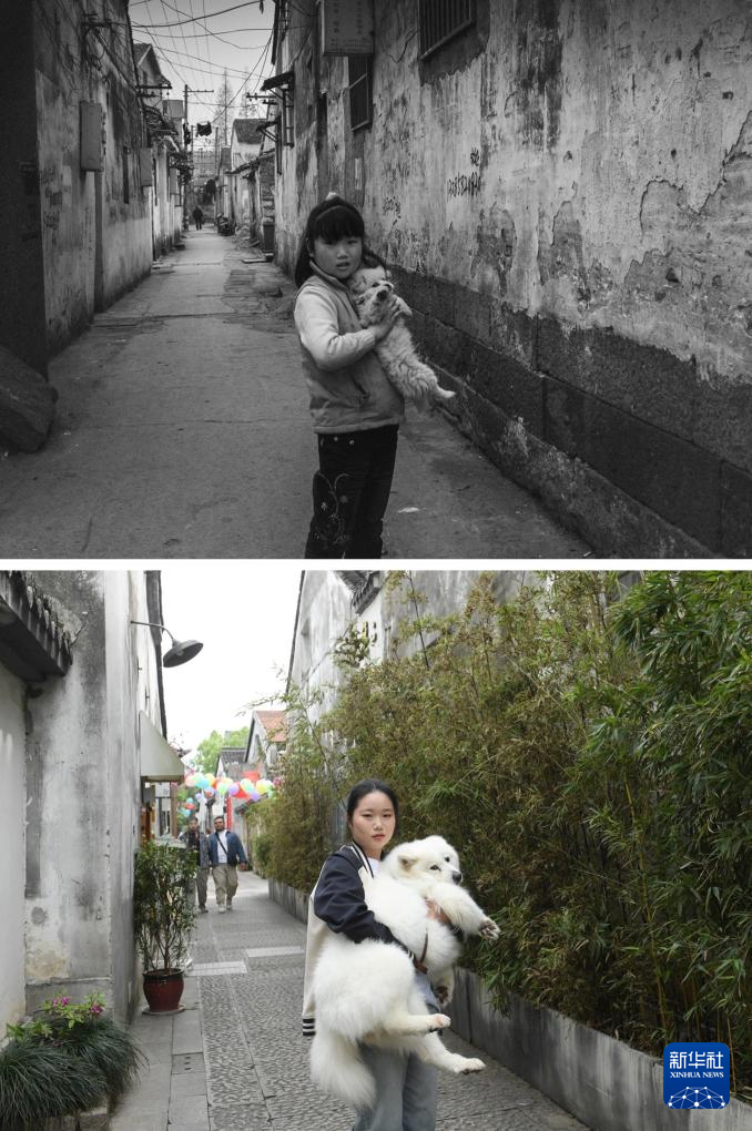 图为2008年拼版照片:上,正在湖州幼西街的家门口(肖二摄)6岁的陈萍抱着宠物狗“波斯”站;4年4月21日下图为202,店的湖州幼西街老家门口留影(新华社记者翁忻旸摄)22岁的陈萍抱着现正在的宠物狗“球球”正在改成素食。