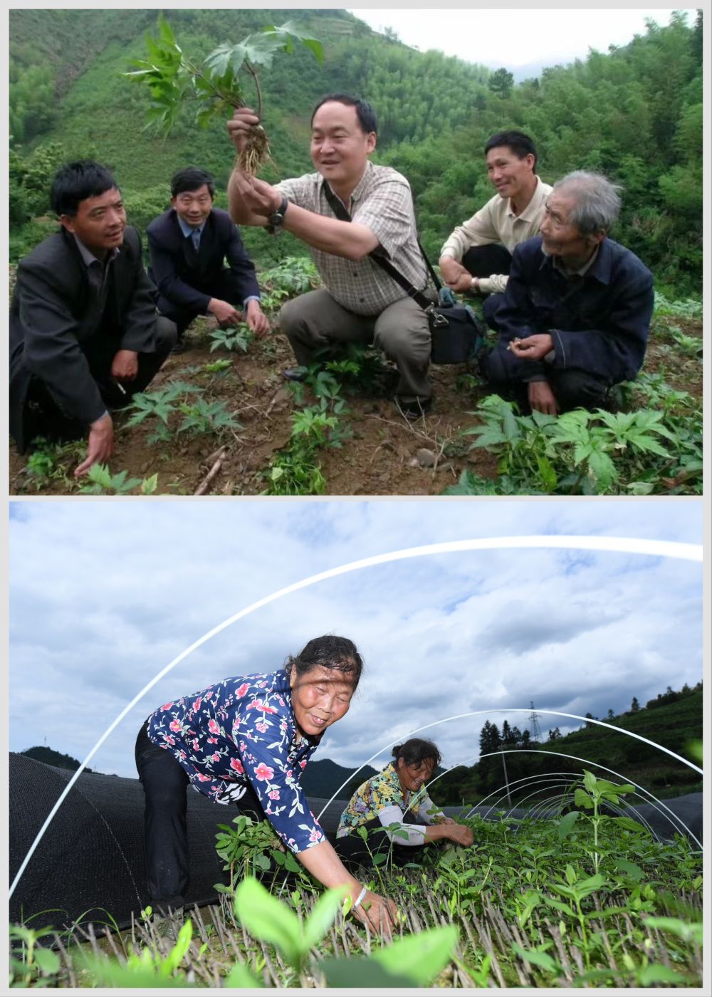 平(中)向淳安县下姜村村民教学中药材种植能力(材料照片)拼版照片:上图为浙江省中药探究一齐限公司正高级工程师俞旭;7月3日下图为,材扦插苗的发展处境(新华社记者翁忻旸摄)村民正在淳安县下姜村一片种植基地查看中药。华社新发