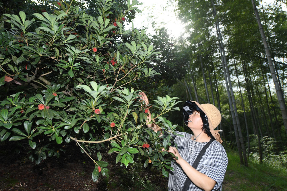 广度乡瓦垚头村正在浙江省仙居县,的村民郑文娟正在查看杨梅长势(7月4日摄)浙江大学处境与资源学院教练吴良欢结对辅导。 翁忻旸 新华社记者摄