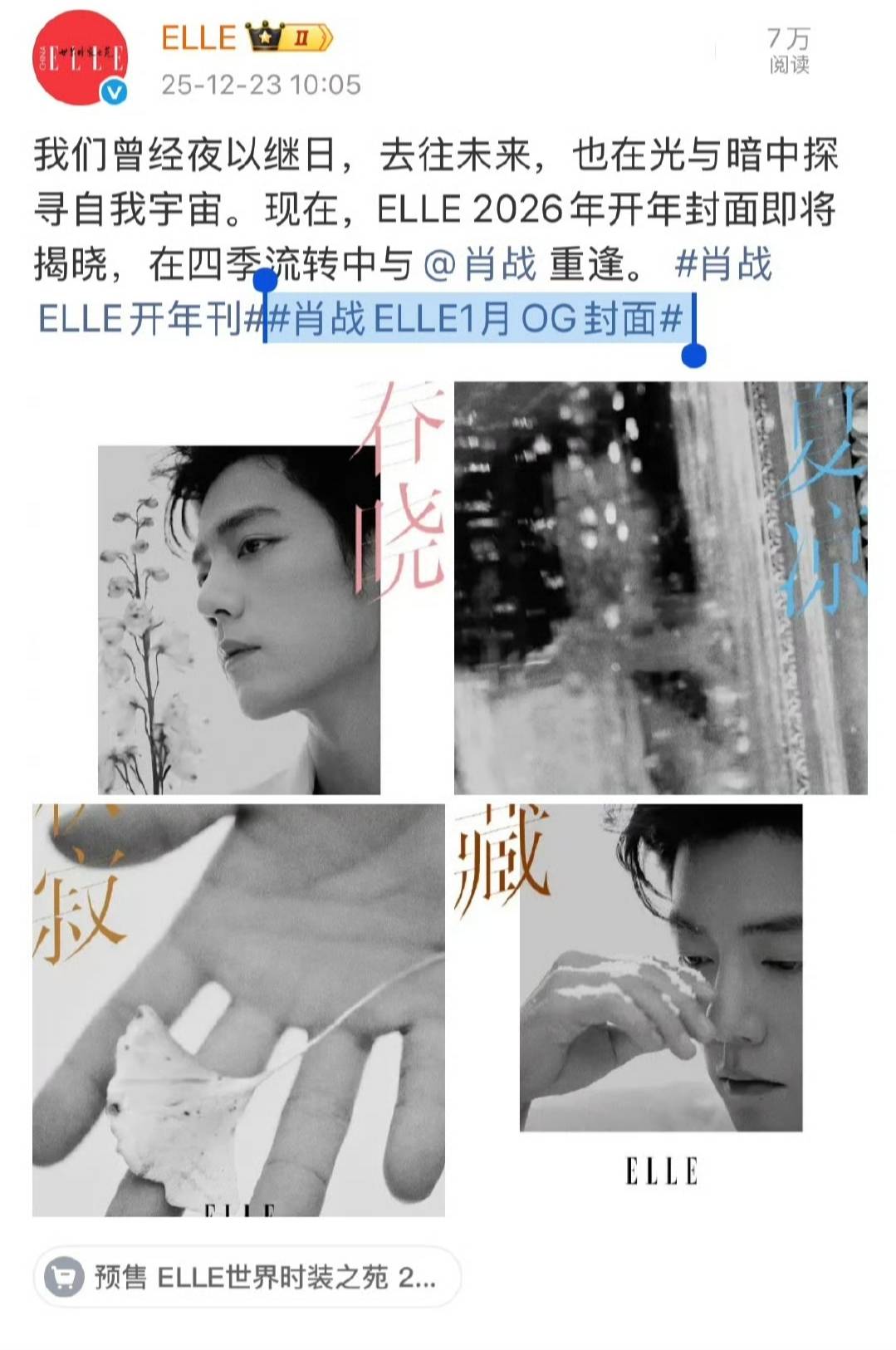 三度登封《ELLE》2026年开年刊时尚圈迎来一场“表象级”事务——肖战,(单人独吞全期封面)引爆全网热议以“四序流转”为主旨的OG封面。23年刘雯OG封面后这不单是该刊自20,推出单人全封规格近三年头次为艺人,7年改为月刊往后更成为其自201,获此待遇的男星九年内第三位。响力与艺术体现力肖战以顶级时尚影,行业标杆再次鼎新。