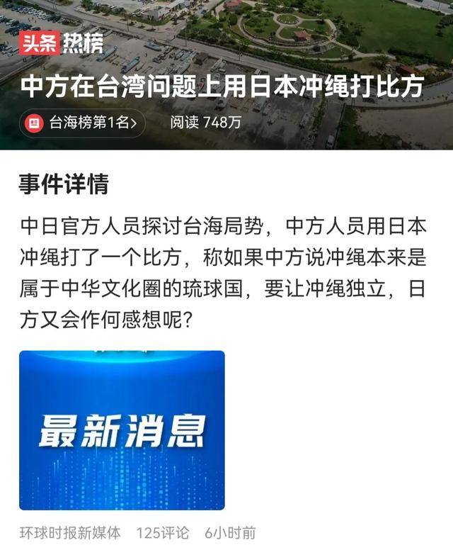 重心益处的重心台湾题目是中国,和避免纠葛台湾题目为了让日方容易意会,冲绳打了一个笑趣的比如中方职员还特地用日本,是属于中中文明圈的琉球国举例假若中方说冲绳正本,日方有何感念要让冲绳独立,常霸气又很解气这个比如打的非,为都是不道义和违警的任何闭涉他国内政的行,的苛酷指摘和批驳必将遭到国际社会,而三的好言相劝咱们一而再再,懂听不进去如若再听不,重重的铁拳迎来的将是。